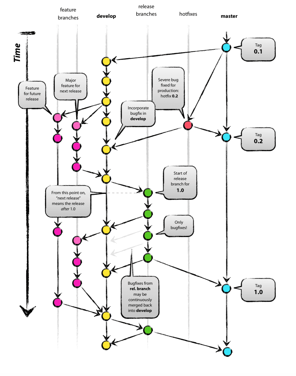 develop branch의 소스코드가 안정적인 지점에 도달하고 릴리즈할 준비가 되면 모든 변경사항을 master에 병합한다음 release 번호로 태그를 지정한다.