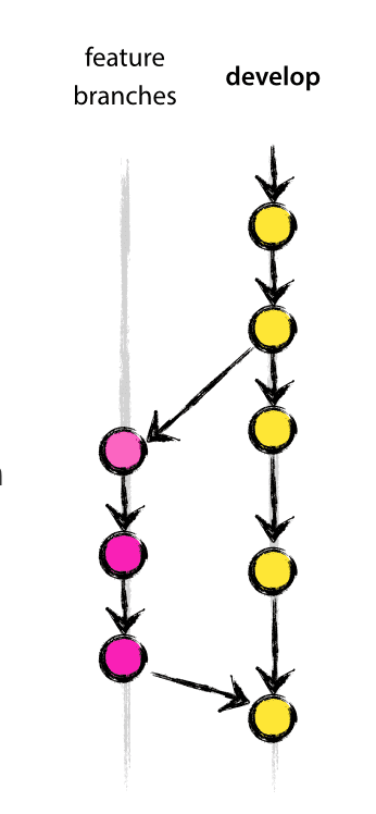 feature branch는 develop branch에서 분기해서 다시 develop branch 로 다시 병합된다.